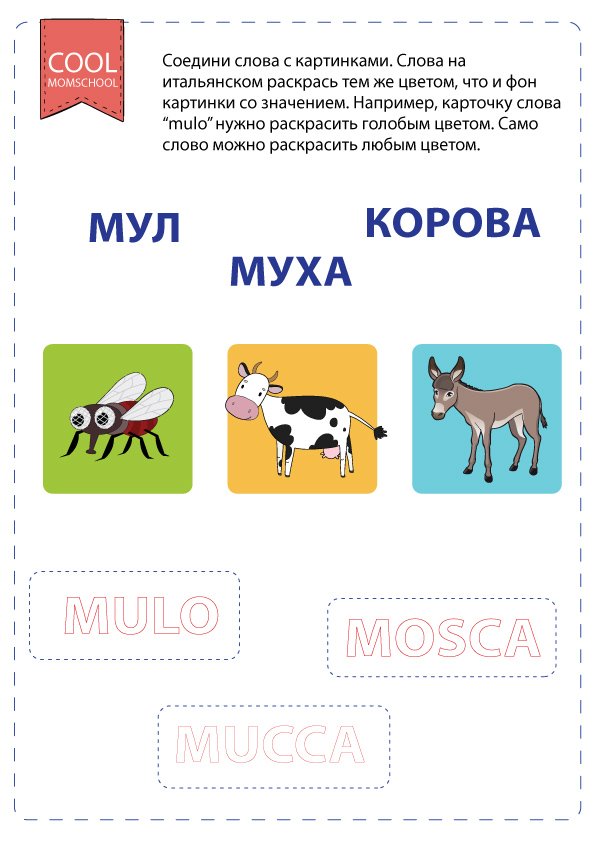 Рабочий лист с тремя итальянскими словами: mulo, mosca, mucca. Им соответствуют слова на русском языке: мул, муха, корова. Нужно соединить с картинкой и с переводом слова. Слова на итальянском можно раскрасить любым цветом, но карточки под ними нужно раскрасить тем же цветом, на котором изображены соответствующие им животным. Например: карточку слова mulo нужно раскрасить голубым цветом.