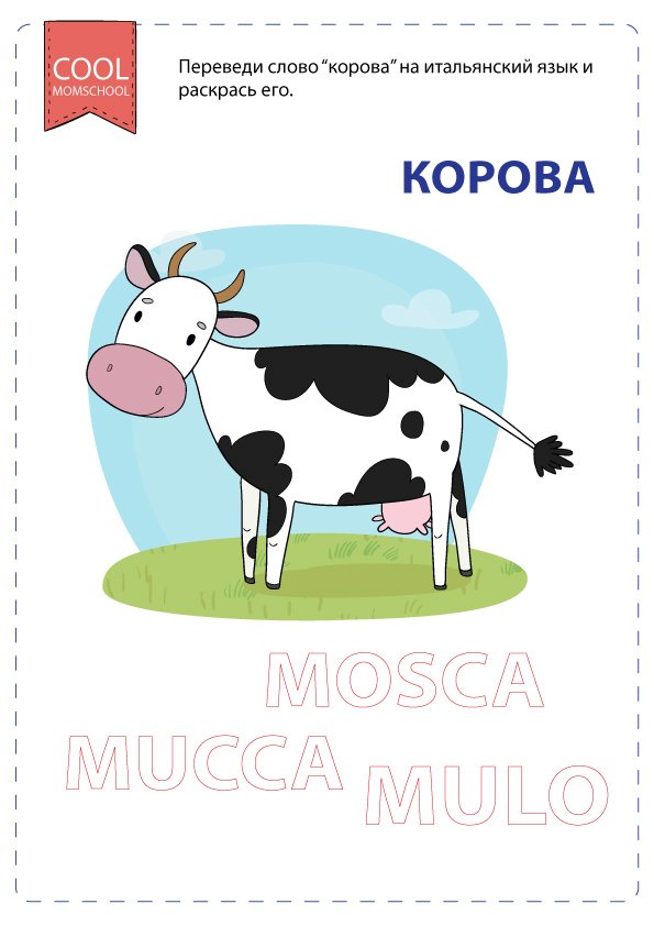 На этом рабочем листе с заданием для билингв, нужно подобрать слово на итальянском соответствующие значению “Корова” и раскрасить его. Вокруг слова Mucca расположены похожие по написанию и значению (из мира животных) слова.