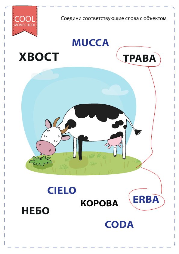 На странице сверху нужно соединить линией одинаковые слова на русском и итальянском, а затем соединить тих с соответствующим им объектом. Например: слово Трава и одинаковое по значению но уже на итальянском слово erba соединяем с травой на рисунке.